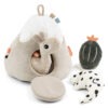 Il trouvera des feuilles qui crépitent, un petit miroir, Croco qui se cache derrière la porte et d\’autres détails amusants. Dans le cube, l\’enfant pourra cacher ses petits trésors ou les trois balles hochet incluses aux jolies couleurs.