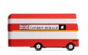 Bus en bois de hêtre massif, peinture à base d’eau avec couche d’uréthane transparente, jantes et pneus en polymère (ABS). Dimensions : 14 x 4,5 x 7,5 cm.
