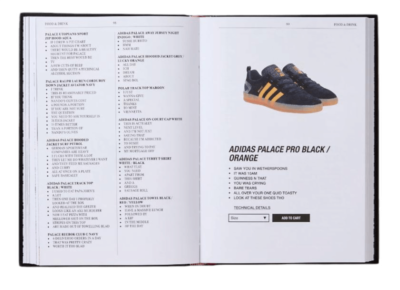 Rédigées par Lev Tanju, cofondateur de Palace, dont le style inimitable a bouleversé les règles du copywriting, les descriptions sont pleines d’humour, de pathos, de commentaires sociaux et d’opinions non dissimulées.