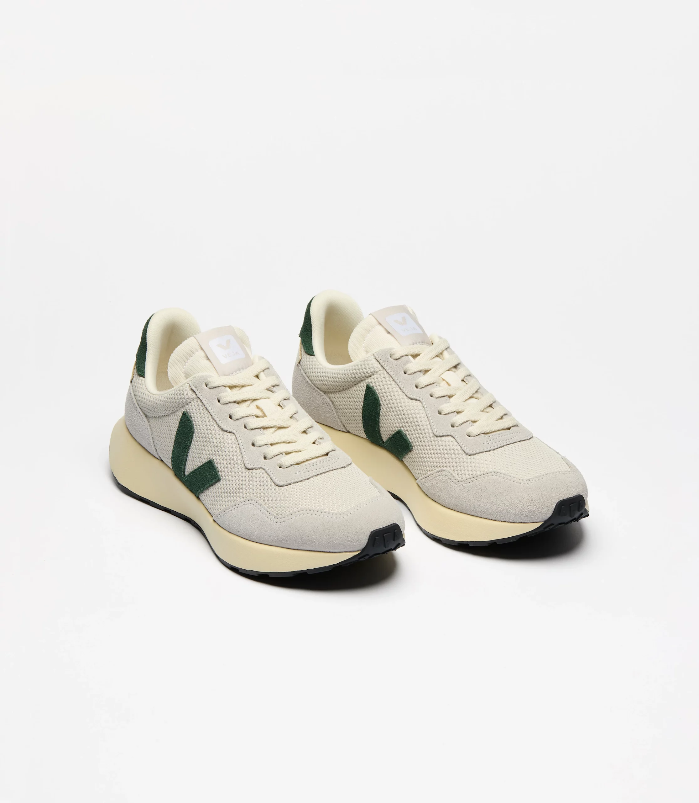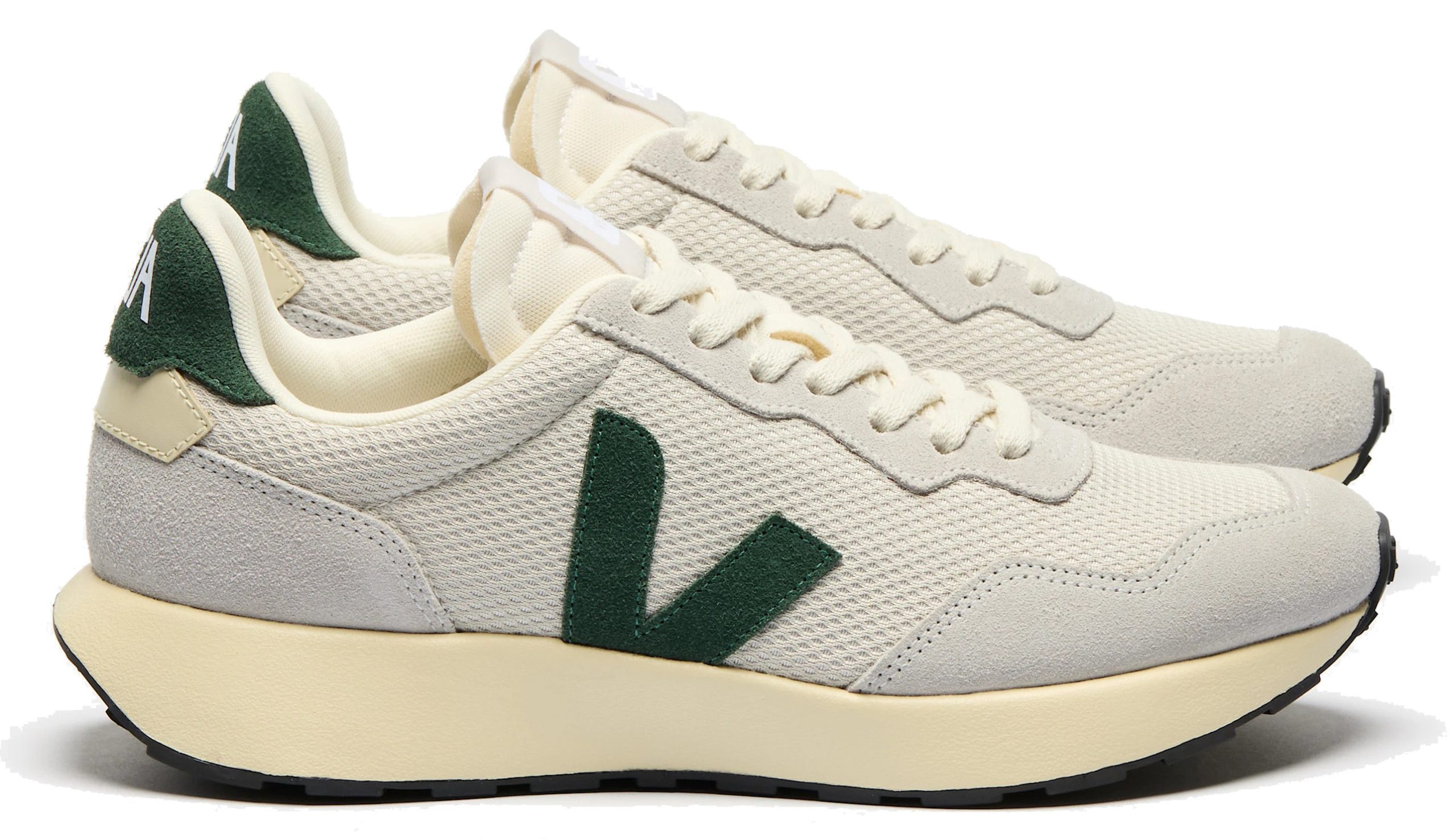 Tige : Alveomesh (100% polyester recyclé) Empiècements : Suède et Cuir Semelle intérieure : Caoutchouc d’Amazonie (10%), E.V.A. bio-sourcé (42% dont 33% canne à sucre), E.V.A. recyclé (12%), coton biologique (11%) et autres (25%) Semelle intermédiaire : E.V.A. bio-sourcé (88%, dont 50% canne à sucre) et autres (12%) Semelle extérieure : Caoutchouc d’Amazonie (12%), silice minérale (30%), caoutchouc synthétique (49%) et autres (9%) Doublure : Polyester recyclé (100%) Lacets : Coton biologique (100%) Fabriqué au Brésil